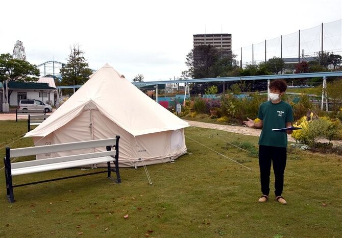 旧かしいかえん南側の芝生ゾーンをメインに利用した施設で、大きくオートサイト、ドッグラン、ワーケーションサイト(2022年5月開業予定)、アスレチックサイトの4エリアからなる。メインはオートサイト。犬同伴サイトを含めて全38区画を用意し、各区画、広さ100平方メートル程度と広々としたレイアウトが魅力。グラウンドはどこも芝生敷きで、フカフカだ。
