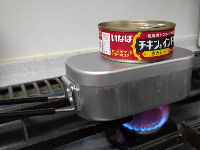火をつけて10分ほどで湯気が立ち、吹きこぼれてきますが、そのまま火が消えるまで待ちます。メスティンの箱に「火力調節いらずの半自動炊飯」と書いてあるのはこのこと。蓋がパカパカ浮いてきそうなら缶詰を乗せて、それをおかずにするのもいいですね。