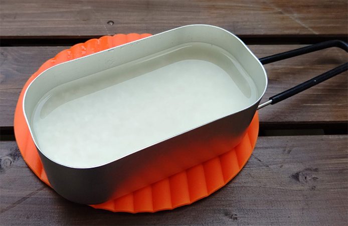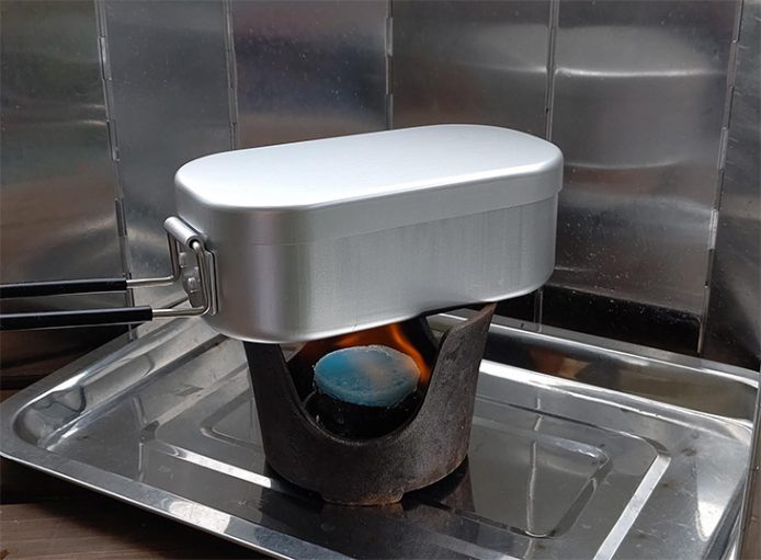 コンパクトストーブ+固形燃料、アルコールバーナー、シングルバーナー、それぞれの「ご飯の炊き方」説明書が付属していているので好きな道具で炊きましょう。筆者は、火をつけたら後はほったらかしの固形燃料で炊いてみます。