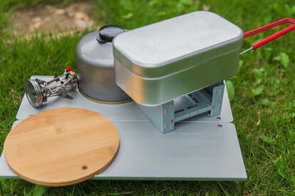 メスティンの良さは、その携帯性にあります。最近のメスティンはアルミ製のものが多く、軽くて壊れにくく、また、熱伝導率が高い素材であるため、加熱時間が短くて済みます。また、弁当箱のような形態は、調理中に蓋ができるため、さまざまな調理を行なうことができますし、出来上がった料理を食べる際の食器にもなり、余分な荷物を持たずに済むという点も魅力です。