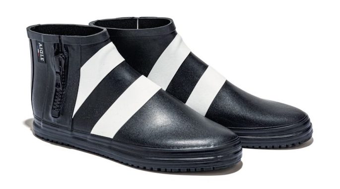 天然ゴム素材で覆われたタフなデザインでありながら、エーグルのアイコンであるダブルストライプを甲部に施してカジュアルに。外側のサイドジップで脱着が楽々とでき、晴れた日でも履けるようにショート丈にアレンジされています。