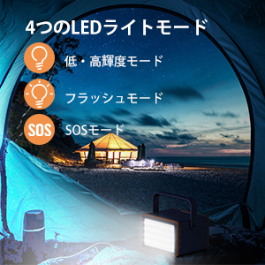 バッテリー残量、充電、放電などの動作状況が一目でわかる液晶画面により、ポータブル電源初心者でも安心して使用できます。超高輝度LEDライトは、ライトボタンを押すと4つのモード(低輝度、高輝度、フラッシュ、SOS)の切り替えが可能。夜間照明としても便利で、SOSモードにすれば緊急時のSOS信号としても活躍します。